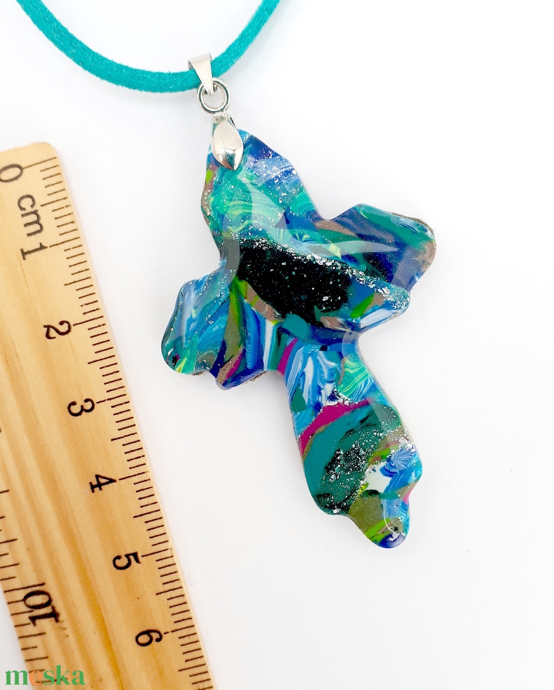 - Anyaga: ékszergyurma, fém szerelék, füstfólia, műgyanta, türkiz bőrzsinór, gyurma, süthető gyurma