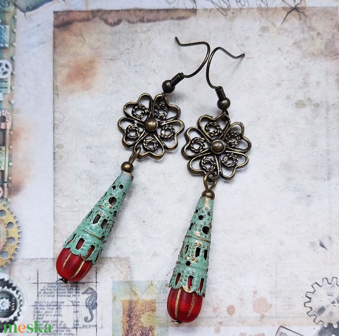- Anyaga: fülbevaló akasztó, patina, üveggyöngy, bronz köztes