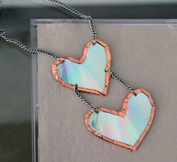 Bátrabbak, esetleg a tiffany techniában jártasabbak próbálkozhatnak ilyen medálokkal is; itt a szív alakúra vágott CD darabkák réz foglalatot kaptak.