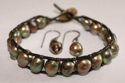 édesvizi gyöngy, 1,5 mm vastag bőr zsinór, réz drót, kagylóhéj gomb