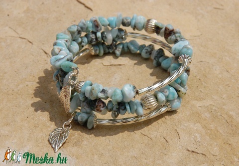 Larimár töret ásvány, memória drótos karkötő, ezüstözött díszek