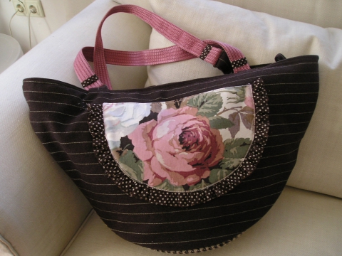 barna csíkos és pepita szövet, rózsás pamutvászon, barna pöttyös műselyem, cipzár, karabiner, mágneszár, csatok