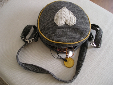 szürke halszálkás szövet, kötött anyag, rózsás pamutvászon bélés, sárga pamutvászon, cipzárak, csatok