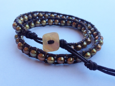 édesvizi gyöngy, 1,5 mm vastag bőr zsinór, réz drót, kagylóhéj gomb