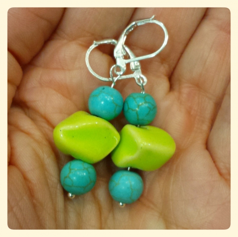 Ezt a teljesen egyedi és rendkívül mutatós fülbevalómat 8mm-es valódi, természetes türkiz gyöngyökből készítettem, melyek közé egy zöldes-sárgás színű, kézzel készült kerámia gyöngy került.