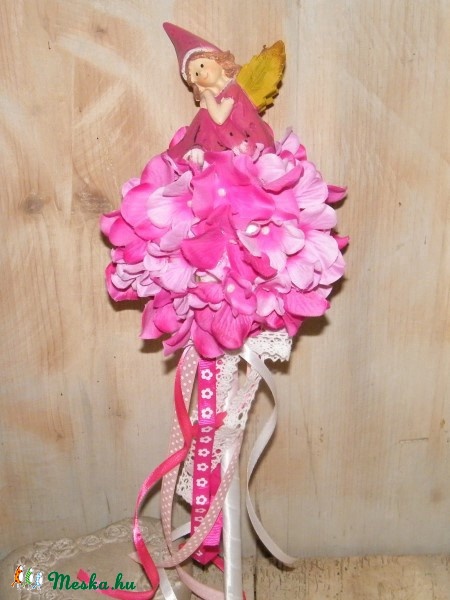 selyemvirág, hungarocell gömb, tündérke, csipke, szalag
