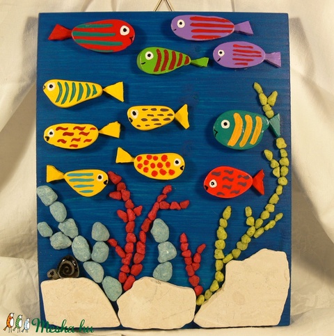 fa, kültéri fafesték, kövek, kavicsok, ragasztó, akril festék, fényes lakk, képakasztó