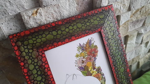 Pirogravírozott zöld-piros-barna, buborékos képkeret