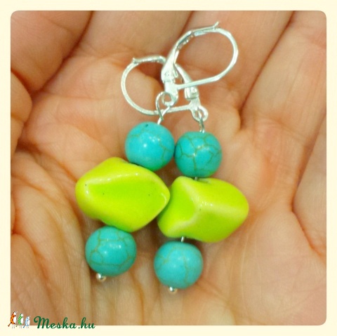 Ezt a teljesen egyedi és rendkívül mutatós fülbevalómat 8mm-es valódi, természetes türkiz gyöngyökből készítettem, melyek közé egy zöldes-sárgás színű, kézzel készült kerámia gyöngy került.