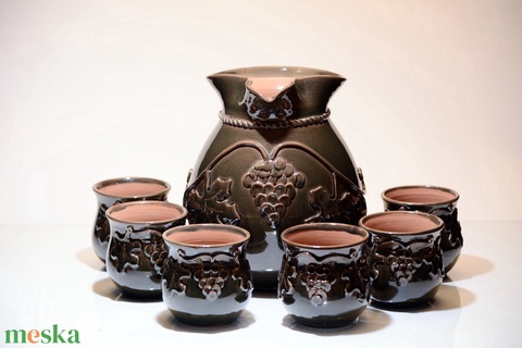 Legyen szó baráti összejövetelekről vagy családi ünnepekről hozzá tartozik a borozgatás.Ezekhez az alkalmakhoz ajánlom ezt a szőlő mintás készletet.A kancsón lévő minta a kis poharakon ismétlődik. Kívül zöld mázat használtam, belseje étkezési célra alkalmas mázzal van kimázazva.