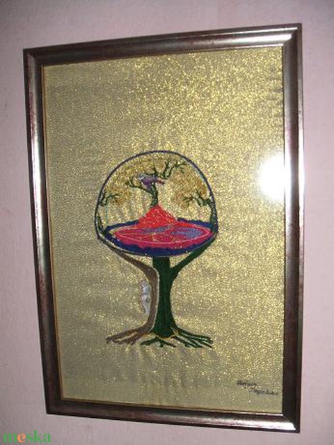 Életfa egyedi hímzéssel, bekeretezve.