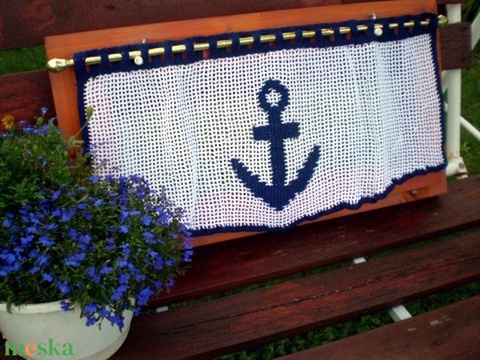 "Horgonyra fel"--Kék-fehér vasmacska mintás horgolt csipkés vitrázs függöny.