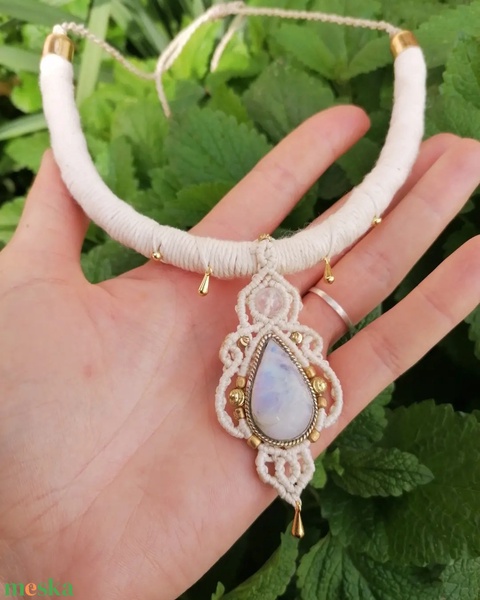 - Anyaga: makrame fonal, holdkő, szivárvány holdkő, réz gyöngy, kender