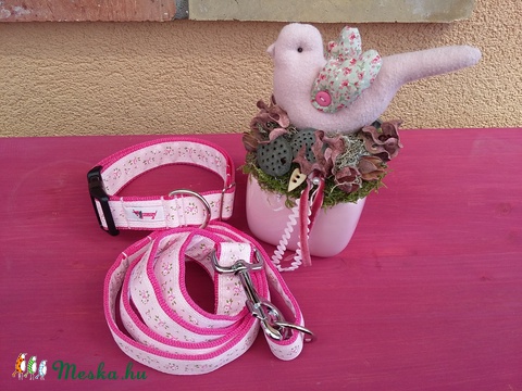 Polka Dog shabby, vintage rózsás nyakörv-póráz szett, eper-puncsfagyi színben