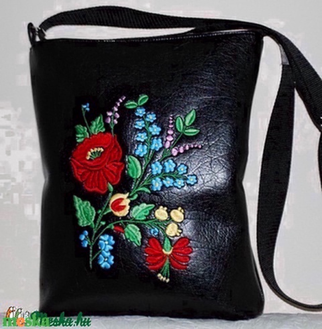 Fekete bőrtáska kalocsai hímzéssel 2