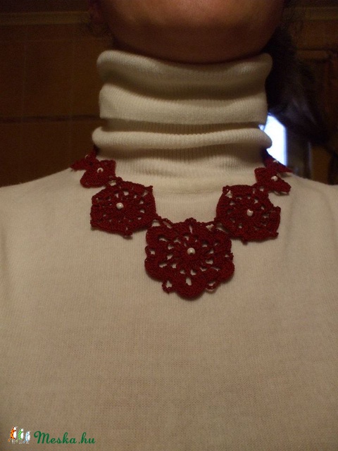 Sötétbordó színű pamut horgolófonalból készítettem ezt az igazán egyedi nyakláncot. Virágmintája romantikus régmúltat idéz, egyaránt szép viselet nyári ruhához és akár egyszínű garbókhoz is, különösen jól feldobja ez utóbbiak viselését. A teljes hossza akasztóval 45 cm. Az akasztója nikkelmentes fém. A nyakból kb. 10 cm-t lóg le. A bordó rózsák közepén fehér kásagyöngy díszíti a nyakláncot. A horgolófonal alapvetően is jó tartást biztosít, de a tökéletes hatás miatt a nyaklánc keményítve is lett. Megfelelő tárolással alakját évekig megőrzi.