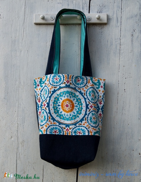 Erős sötétkék farmervászonból készült ez az egyszerű, de praktikus szatyor, válltáska, melynek elejét kékes-színes dekoratív pamutvászonból varrtam.