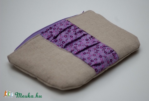 Natúr lenvászonból varrtam ezt a cipzáras tokot, elejét lila virágos ráncolt pamuttal díszítettem, a hátulja natúr lenvászon.