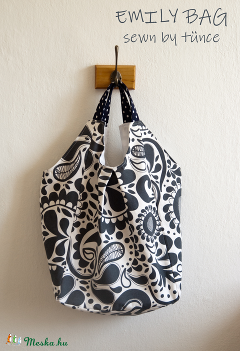 A képen látható anyag egy erős lakásdekor vászon anyag, dekoratív sötétkék virág- és indamintával, bélését fehér pamutból készítettem, füleit sötétkék-fehér pöttyös pamutból, amit közbéléssel jól megerősítettem.