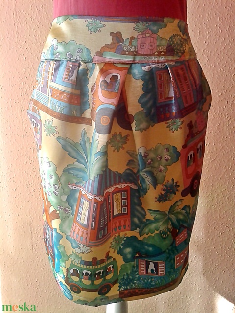 Gyönyörű, enyhén selyemfényű, vidám, színes szaténból készült ez a klassz tulipánszoknya. Igazi egyéniségeknek ajánlatos :) Amellett, hogy igazán csinos a szabása, nagyon klassz vidám, igazán egyedi az anyaga. Nagyon szuper, nőies, a csípőt szélesíti, a derekat karcsúsítja, a berakások fokozzák a kényelmet, és a két oldalzseb is nagyon praktikus. hátul középen cipzárral záródik.