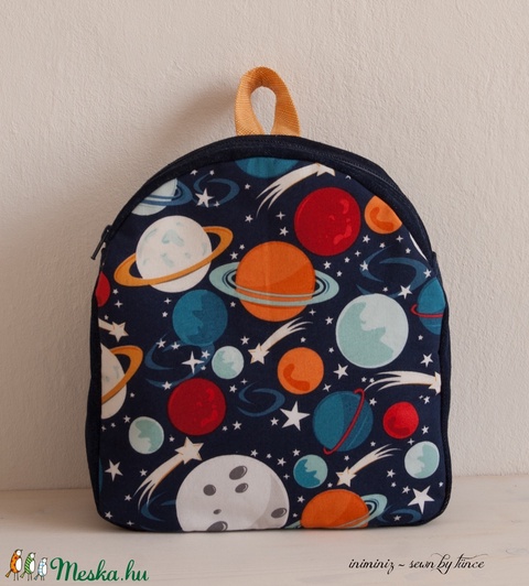 Aranyos gyermek hátizsák, bolygómintás patchwork pamutból készül az eleje, a többi része erős kék farmer. Teljesen bélelt, bélését világoskék pamutból készítettem, vállpántok és kis akasztó/fogó varrásához pedig a narancssárgás pamutot használtam.