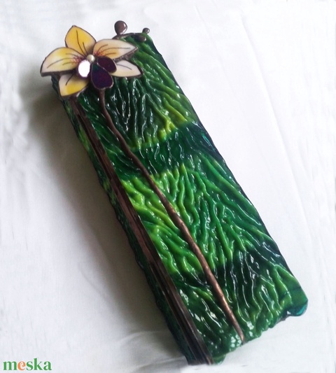 - Anyaga: uroboros zöld, uroboros sárga, spektrum irizált lilás-rózsaszín, réz-zsanér, üvegfesték -kontur, ón ólom forraszanyag, üveg gyöngyök, rézfólia és u.ólomprofil, lakk