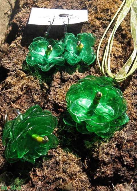 Zöld virág szett pet palackból készült újrahasznosított fülbevaló, gyűrű és medál