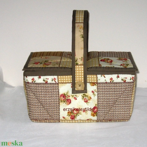 Kézimunka- vagy varrókosár sárga-viágosbarna-rózsás patchwork mintás anyagból
