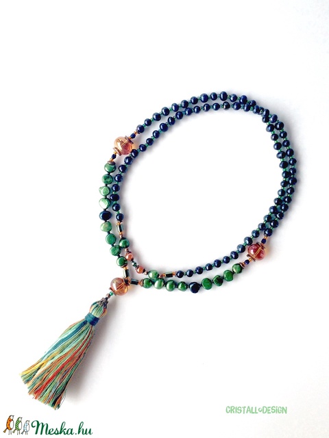 Készítéséhez henger formájú írizáló türkiz hematit, narancssárga üveg, mohazöld és fekete tenyésztett gyöngyöt használtam, szinben harmonizáló bojttal díszítettem.