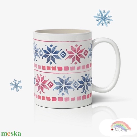 Kék-piros skandináv mintás, hópelyhes karácsonyi bögre. Téli hangulatú kerámia bögre.