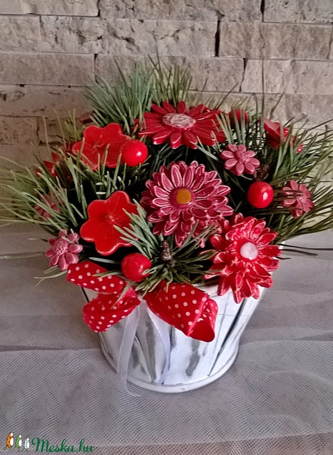 Kézzel készített mázas kerámia virágok festett drót száron , antikolt kaspóban, száraz virággal kiegészítve.A kompozíció kb. 22cm magas 20cm átmérőjű. Ezek a kézműves virágok nem kérnek sem fényt sem vizet és mégis üde szép szín foltja lehet lakásodnak . De ajándékként is büszkén megállja a helyét.