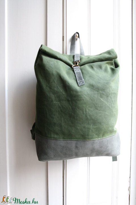 Zöld viaszolt vászon és szürke bőr hátizsák