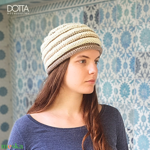 Csíkos kötött női sapka - bézs krém téli sapka - meleg puha gyapjús fonalból