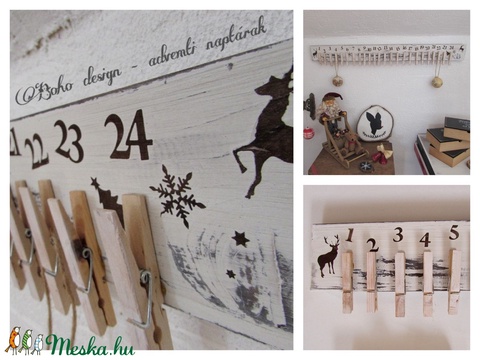 Barna pácolt alapon fehér antikolt mintás karácsonyi, adventi kalendáriumtartó.