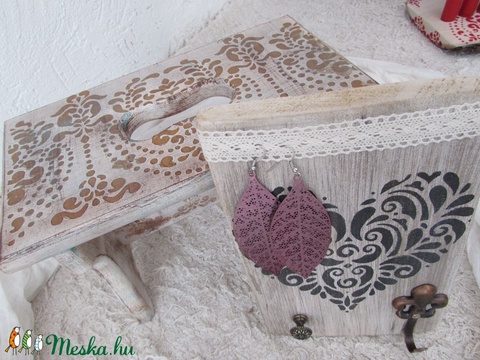 Vintage, antikolt fehér kis sámli, festett arany mintával. Helyenként türkiz is van benne nagyon halványan.