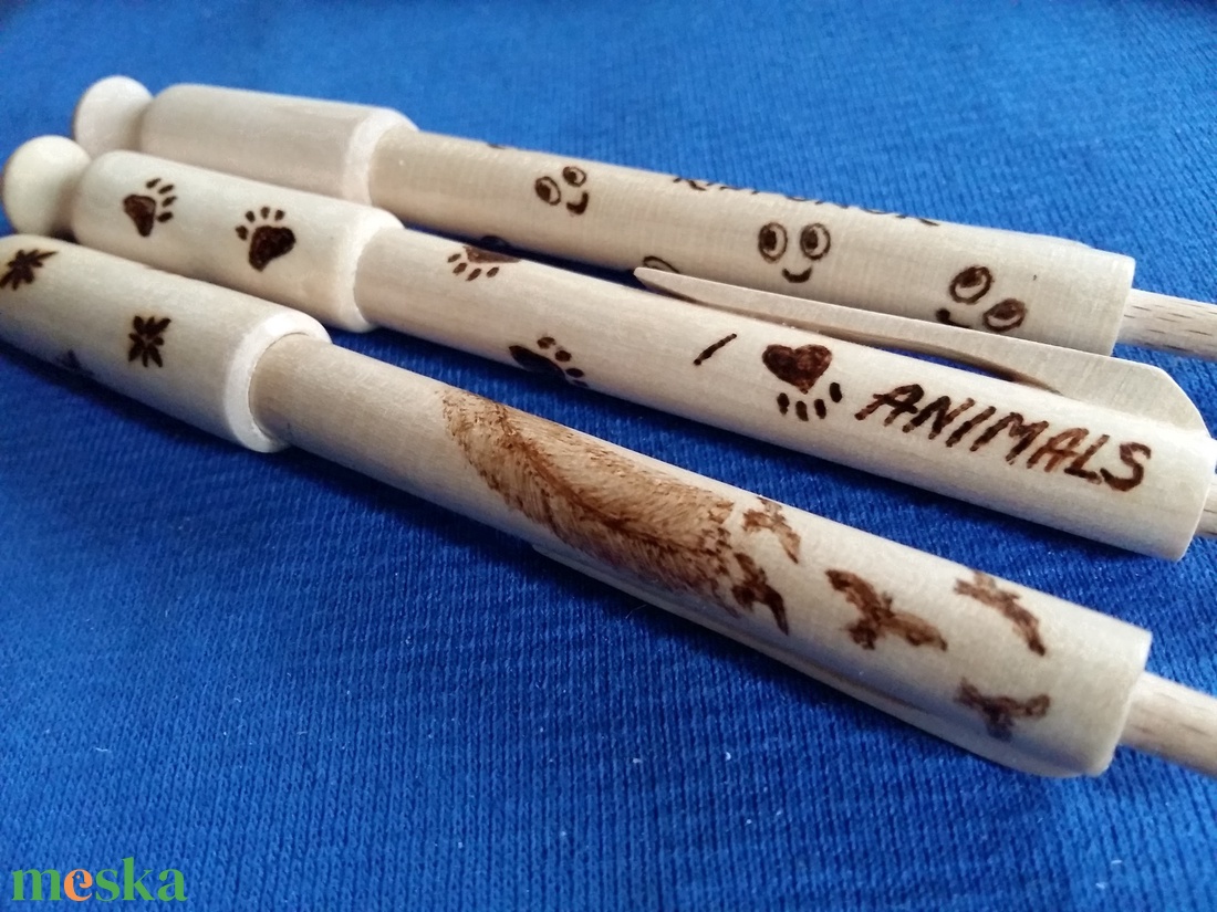 Személyre szóló, pirográf technikával díszített fa toll