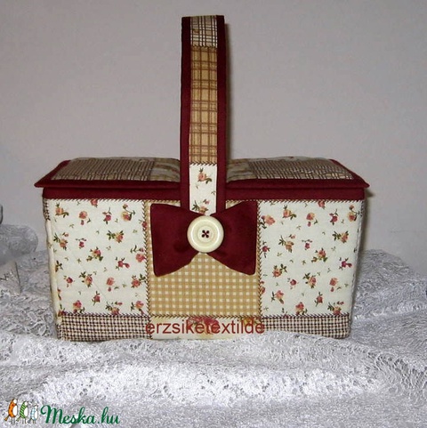 Kézimunka- vagy varrókosár sárga-viágosbarna-apró virágos, rózsás patchwork mintás anyagból