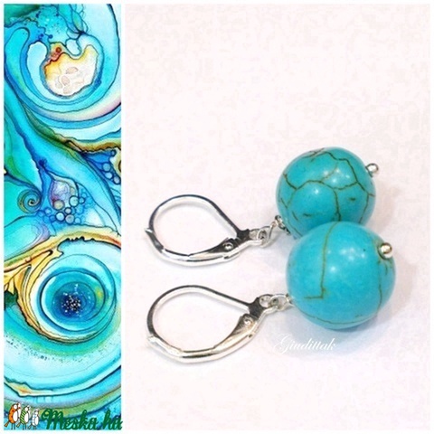 A türkiz gyöngyök 1,2 cm méretűek, melyeket nikkelmentes fém fülbevaló akasztóra illesztettem.