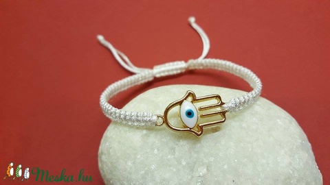 Arany színű fatima keze összekötő elemből készítettem a karkötőt hófehér shamballa zsinórral.