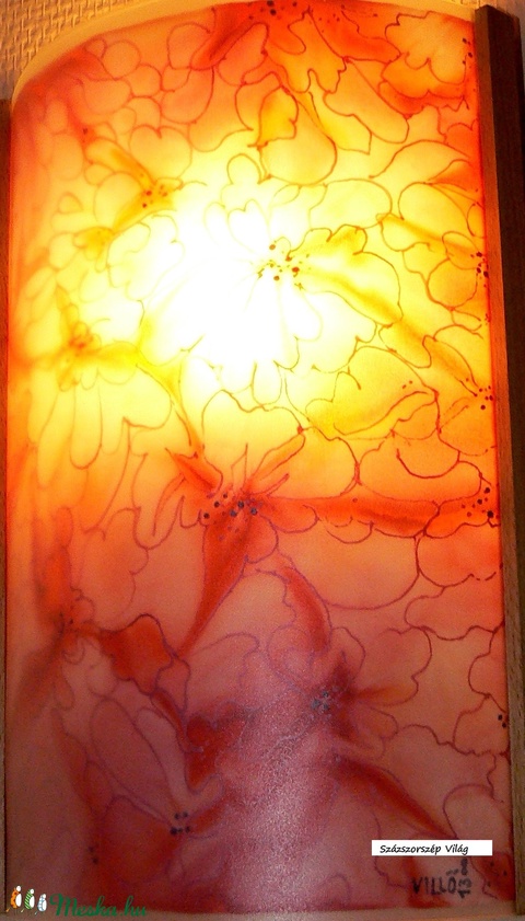 - Anyaga: valódi hernyóselyem, selyemfesték, fólia, fakeret, lámpa szerkezet, selyem kontúr, csillámfesték