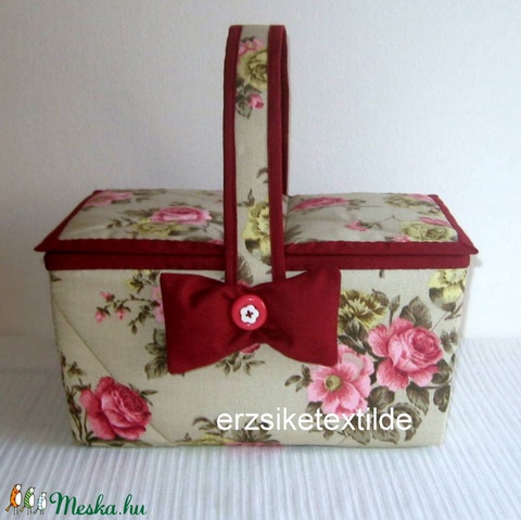 Varró- vagy kézimunka kosár bézs alapon rózsás