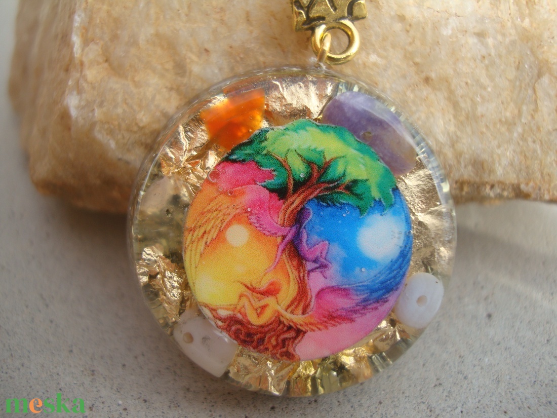 Csodaszép arany színű orgonit medál angyalkák szimbólummal amely Jádéval, Karneollal, Citrinnel, Csaroittal, Kalcedonnal, Rózsa opállal, Szelenittel, hegyikristállyal, sok-sok szeretettel és pozitív energiával készült :-)