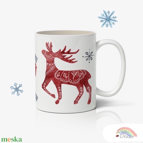 Skandináv hangulatú, rénszarvasos-madaras karácsonyi bögre. Téli ajándék bögre.