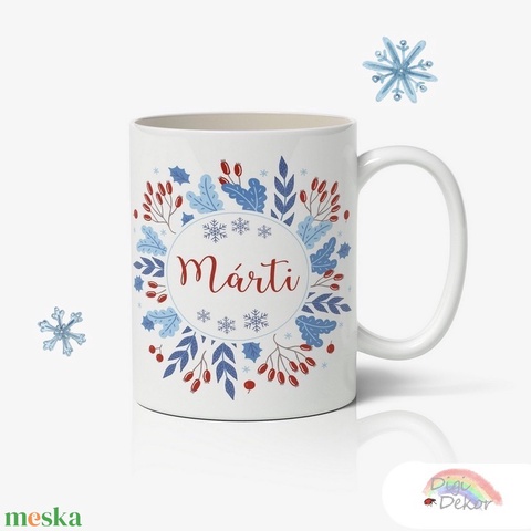 Névre szóló, karácsonyi motívumos bögre nőknek. Kék-piros növényekkel díszített kerámia bögre.