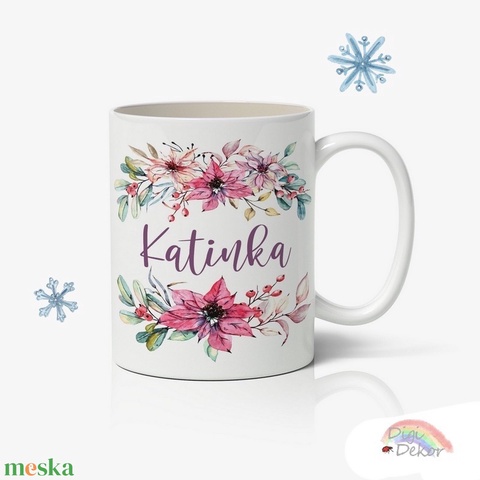 Neves karácsonyi bögre nőknek, csodaszép mikulásvirággal díszítve.