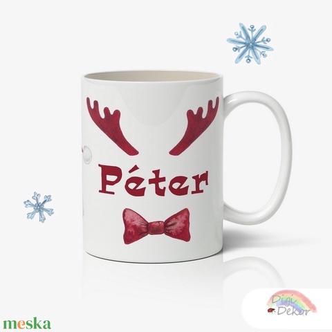 Vicces, névre szóló karácsonyi bögre szarvasaganccsal és csokornyakkendővel.