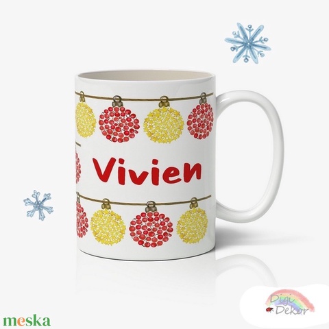 Piros-sárga karácsonyi díszes bögre névvel.