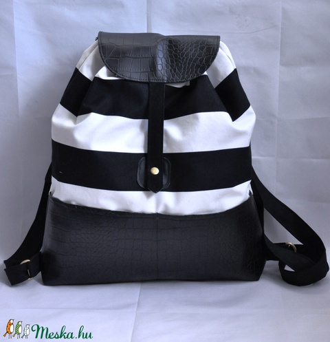 Fekete-fehér csíkos hátizsák, elöl két zsebbel
