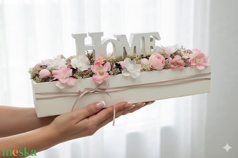 asztaldísz – HOME felirattal, fehér és halványrózsaszín virágokkal