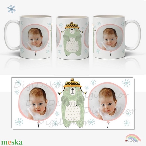 Jegesmedvés-lufis téli bögre 2 fényképpel. Egyedi karácsonyi ajándék bögre nagyszülőknek, szülőknek.
